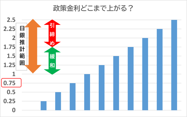 私のメインシナリオは、政策金利が現状の0.75%から、今後2年で4回(0.25%×4)利上げされ、1.75%になるというものです。1.75%という水準は、日銀が推計している中立金利レンジ(1%〜2.5%)のちょうど真ん中あたり。